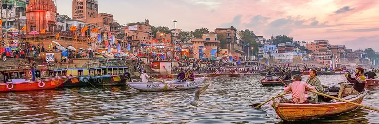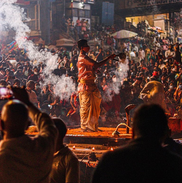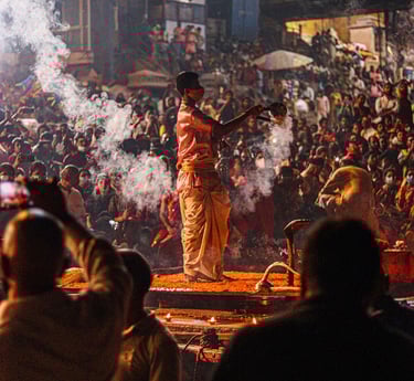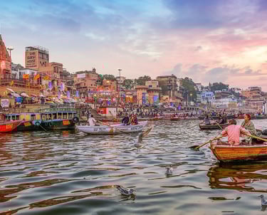 Petit-déjeuner à l'hôtel. À l'aube, promenade en bateau sur le Gange sacré, passant par les Ghâts de Bain, ces marches de pierre où pèlerins et fidèles se rassemblent pour saluer le lever du soleil par des prières et des ablutions rituelles. Temps libre pour se détendre ou faire du shopping en ville. Le soir, cérémonie d'Aarti Puja sur le Gange sacré. Retour à l'hôtel.