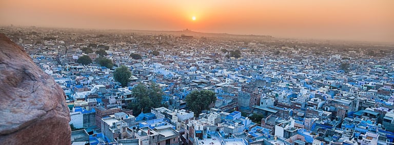 Petit-déjeuner et départ pour Jodhpur, la « Ville Bleue », une ville située aux portes du désert du Thar, caractérisée par des remparts à huit portes qui délimitent sa partie la plus ancienne. Visite de l'imposant fort de Mehrangarh. Nuit à l'hôtel.