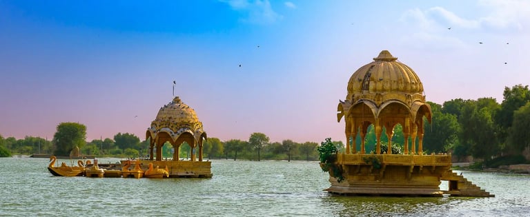 Après le petit-déjeuner, départ pour Jaisalmer, traversant la quasi-totalité du désert de Tar, à la frontière occidentale avec le Pakistan. Jaisalmer est, à notre avis, la destination la plus exotique, digne des « Mille et Une Nuits », de tout le voyage. Arrêt pour visiter le lac Gadi Sagar.