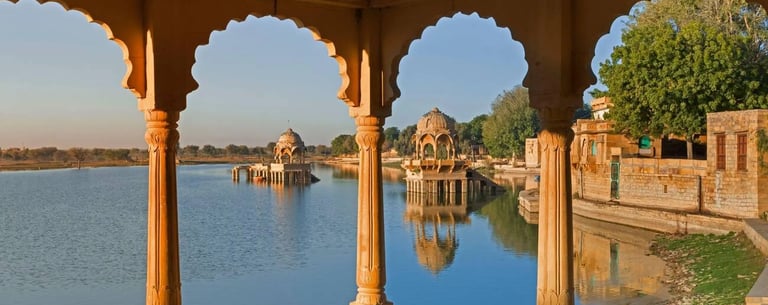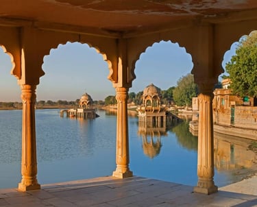 Après le petit-déjeuner, départ pour Jaisalmer, traversant la quasi-totalité du désert de Tar, à la frontière occidentale avec le Pakistan. Jaisalmer est, à notre avis, la destination la plus exotique et la plus « Mille et Une Nuits » de tout le voyage. Arrêt pour visiter le lac Gadi Sagar.