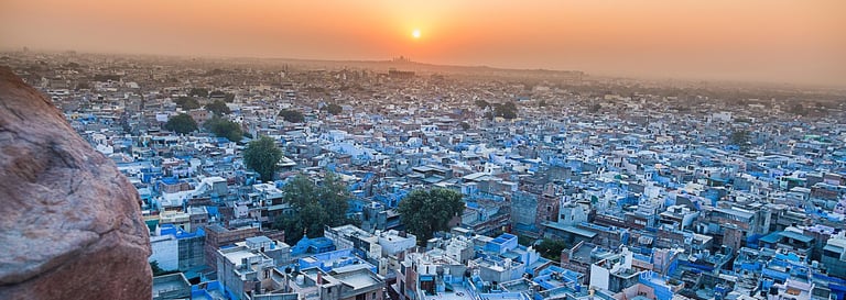 Petit-déjeuner et départ pour Jodhpur, la « Ville Bleue », une ville située aux portes du désert du Thar, caractérisée par des remparts à huit portes qui délimitent sa partie la plus ancienne. Visite de l'imposant fort de Mehrangarh. Nuit à l'hôtel.