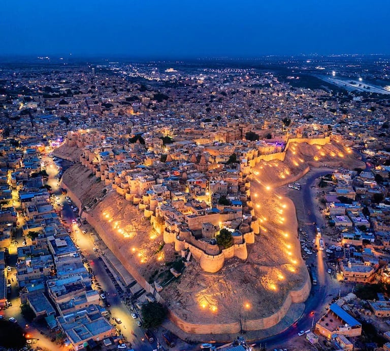 Après le petit-déjeuner, visite de la citadelle fortifiée et de ses palais. Une attention particulière sera portée à ses nombreux temples et havelis, tels que Nathmal Ji Ki Haveli, Salim Singh Ki Haveli et Patwon-Ji-Ki-Haveli. L'après-midi, balade à dos de chameau pour admirer le coucher de soleil sur les dunes du désert du Thar, guidé par des Bédouins locaux, enveloppés dans leurs capes fascinantes. Nuit à l'hôtel.